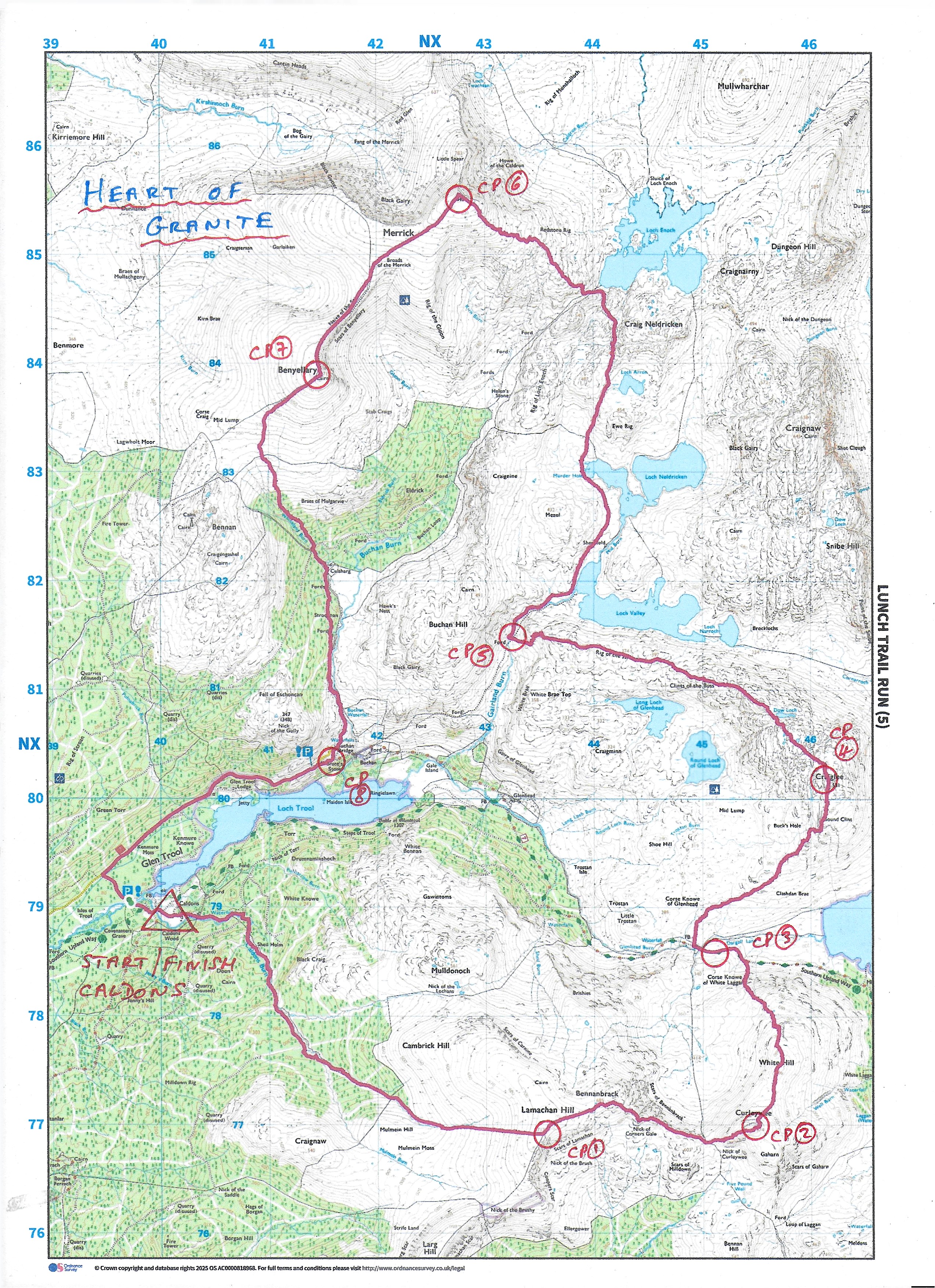 Route: Checkpoints - CP1 Lamachan - Wall summit shelter NX 43523 76907, CP2 Curleywee - Summit cairn NX 45457 76960, CP3 Axe Head stone. Manned with food NX 45242 78617, CP4 Craiglee - Trig point NX 46152 80147, CP5 Path Manned with sweets/snacks NX 43209 81476, CP6 Merrick Trig point NX 42757 85563, CP7 Benyellary Summit cairn NX 41492 83877, Follow the Merrick Race route to CP8 Bruce's Stone NX 41577 80349 Then path to the road and road to the Finish.