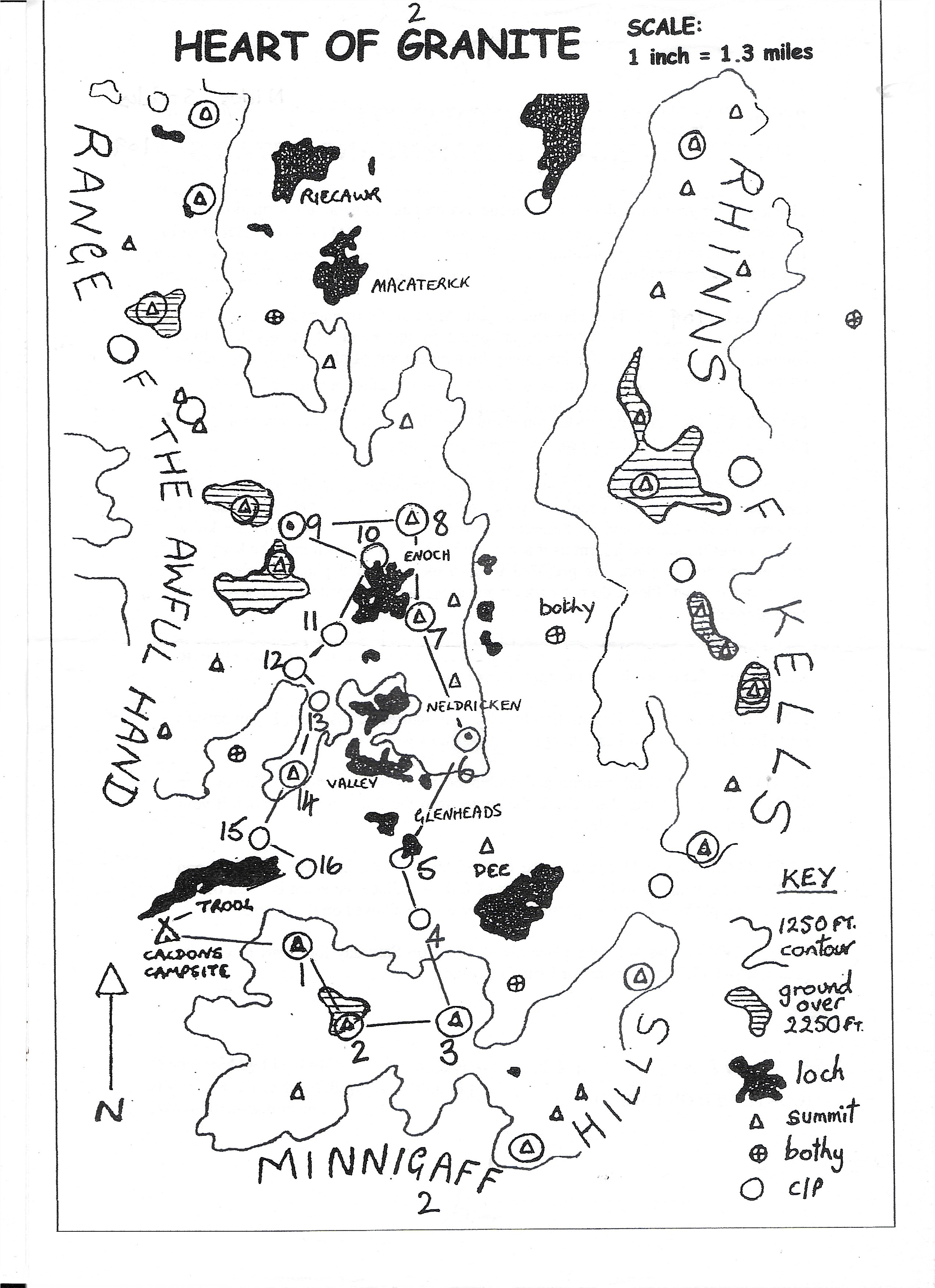 We set walkers off at 4pm and then a relaxed approach meant that teams could start when ready, within reason. All the teams wanted to get off asap to do more in the better weather and daylight. From 4pm to 10pm the weather was warm, a bit windy and claggy. But nothing too awful. The terrain and navigation is the most challenging on the first leg but all the teams succesfully got to CP5 on the Dee Bridge track where there was a checkpoint with hot soup, drinks, cake etc. One team retired here so there were seven teams that carried onto Leg 2. Around the time the teams arrived at checkpoint 5 the rain started (10 to 10.30pm) and it hammered it down for six hours as the teams were crossing the Corserine ridgeline. After the initial two tops of Darrou and Miekle Milleau the route follows a ridge which has short grass and a well defined path so "better" terrain than a lot of the first leg meaning you can move faster. The rain and increasing wind meant that the teams had a torrid time and arrived at CP11 on the track wet through and needing sustenance. This they received in quantity and quality from MRT with more soup, hot drinks, cakes and snacks. Another two teams had to drop here due to sickness and injury so five teams headed down the 5 mile valley track to CP12. This section I thought everyone would hate, but actually it was a godsend in the weather to be able to have a break from navigating and be able to digest food and keep moving. CP12 was a smaller checkpoint with hot drinks and snacks before teams headed onto the final stretch up Shiel Hill, Craigmansheenie and onwards and upwards to Merrick. The rain stopped at 6am when the skies cleared and the tops could be seen from the valley. Unfortunately the winds were forecast to pick up around 11am and a decision was to be made then. At this stage there were three Ladies Teams, one Mixed team and one Male team left in the race. One ladies team decided to stop before Craigmansheenie and took a safe route back to the CP12. Four teams then made it over the final hills and were rewarded with clear views, a little sunshine and extremely strong, gusty winds. Shallock on the Minnoch was the worst hit as it's a big round plateau with no shelter. Once off there the teams were slightly sheltered by Merrick and even the summit of Merrick was not the worst place to be. Surprisingly halfway down Merrick to Bruce's Stone carpark the wind was pushing the teams uphill and this was extremely tiring. At the last checkpoint the Bruce's Stone the teams were met by Glyn Jones, the creator of the Rings of Fire round and the first race organisor for the Ring's of Fire races which comprised of the Bruce's Crown and the Heart of Granite. They then had a hard slog down the road / footpaths back to Caldons and a warm welcome at the Finish.